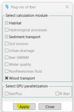 Once installed, Iber Wood can be activated in the menu Iber tools >> Plug-ins..., as shown in Figure 1, and the Wood Transport can be turned on in the Data Window.