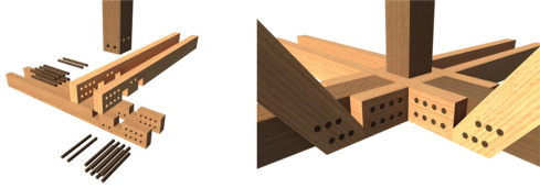 Most of the construction is solved in articulated joints. The joints were designed as pin ones, using beech pegs of the D40 strength class or traditional craft joints. The construction had to be designed so that the wooden joints could transmit the resulting internal forces. The bearing capacity of the wooden dowels was based on tests conducted on the joints of historical buildings (Agel and Lokaj, 2014 ).
