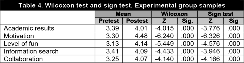 An exploratory analysis of the data was performed; the low values in the preliminary test suggested that the students in both groups had the same initial levels. It was in the postest that scores varied, to indicate significant differences in the values according to the treatment applied. The Wilcoxon and sign tests values, with a significance of 0.01, indicate a statistically significant improvement, thus the research hypothesis is proven in terms of better academic results, greater motivation, level of fun, stronger information search skills and collaboration (Table 4).