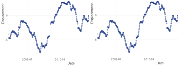 This functionality has also been developed after observing many imperfections in the databases analysed, which come from dam monitoring systems. Other options can be implemented for application in other fields, according to the properties of the data series under consideration. In the current version, in addition to the options already mentioned for the missing data, the user can add a fixed value to the selected period, or delete certain values. Figure 5 shows an example in which it seems clear that the error is corrected by adding a fixed value.