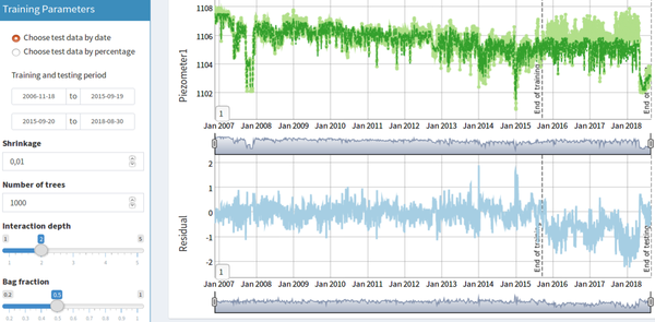 This prior knowledge has been applied to the development of a second application that allows using the data processed by the first one to adjust machine learning models of dam behaviour, as well as interpreting the response of the system to actions or loads in operation. With this approach, the reliability of the conclusions obtained through the application is related to the accuracy of the model predictions (Breiman, 2001). Therefore, the discrepancy between the predictions and the observations is calculated and shown, both for training and test sets (Figure 7).