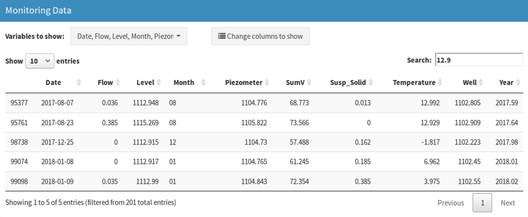 Data exploration is a fundamental preliminary step before analysing data. On the one hand, it allows knowing features of the data to analyse: available volume of data, ranges of variation, relationship between variables, etc. On the other hand, it is useful to identify errors such as anomalous data derived from measurement errors or periods of missing data. In addition, an expert with the adequate tools can draw a first idea of whether the behaviour responds to what was expected, observing clear changes in series trends, dispersion of the results, etc. The tool developed in this work allows the visualization of interactive data tables (Figure 1) where the user can see the values ordered by time, being able to choose the variables and the number of rows to be displayed, as well as searching for a specific value.