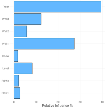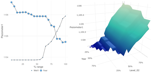 Figure 8 analyses the predictive model through a bar graph that shows the importance of the predictive variables (degree of association with the objective variable) in alphabetical order. In case several models are fitted, the mean value for the influence is shown. The partial influence of the most relevant inputs on the response can be also studied (Figure 9). In this example, it can be easily observed that the response increases with the reservoir level and with well01, and that it has decreased with time.