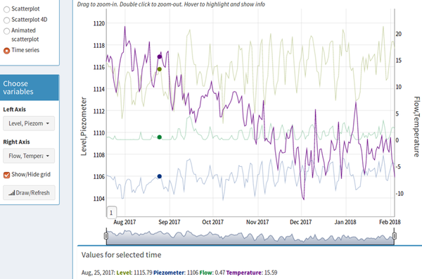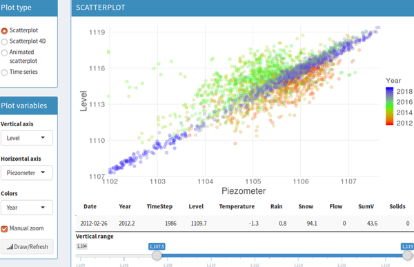 Data analysis is the basis of research studies in many hydro-environmental systems, such as hydrology, reservoir management or dam safety. Advances in measurement instruments as well as transmission and storage information techniques have undergone significant improvements in terms of accuracy and reliability, resulting in greater availability of information on the behaviour of the system under consideration. These advanced monitoring systems require applications capable of handling such large and diverse information. Conventional time-series plots and simple statistical methods are not appropriate to maximise the information extracted from these data.