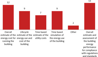 Key performance indices that are calculated to display the energy performance of buildings are provided (IEA, 2012 ; Sanders and Phillipson, 2003 ). These indices include: (1) average thermal transmittance, (2) ventilation heat losses, (3) solar heat gains, (4) internal heat gains, (5) lightning power, and (6) resulting heat demand. The USGSA (2008) provided possible results of energy analysis as follows: (1) assessment of the space and building energy performance for compliance with regulations and targets, (2) overall estimate of the energy use by space and for the building, as well as an overall estimate of the energy cost, (3) time-based simulation of the energy use of the building and time-based estimate of the utility costs, and (4) lifecycle estimate of the energy use and cost of the building.