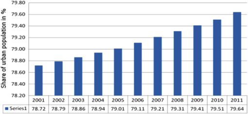Fig. 5. Degree of urbanization in the UK from 2001 to 2011.Source: Statista, 2013. |
