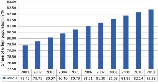 Fig. 4. Degree of urbanization in the US from 2001 to 2011.Source: Statista, 2013. |