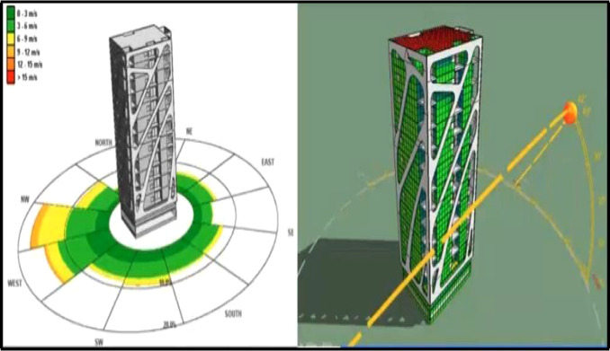 Fig. 10. Arboleda BIM-based energy analysis that shows the windrose and solar path on the BIM model.Source : The material for the aforementioned case study was sourced from the following online articles and videos, Nemetschek Vector Works: Arboleda Open BIM Project. |