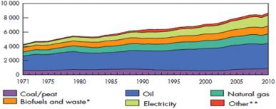 Fig. 1. Total world energy consumption from 1971 to 2010 by fuel (Mtoe).Source: IEA, 2013. |