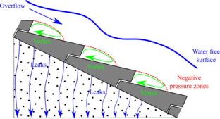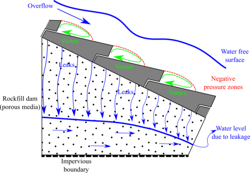 The shoulder of rockfill dams is highly permeable and leakage can flow through towards the impervious boundary defined by the foundation (Figure 9). In order to keep away blocks from uplift pressure the rockfill permeability must be sufficient to avoid contact between the bottom side of the blocks and the water free surface of the seepage net.