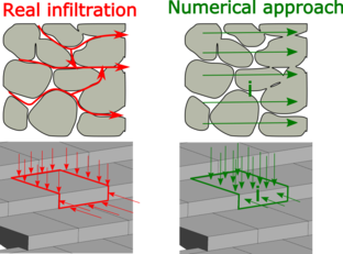 The numerical method is based on a mathematical approach in which the blocks and joints are considered as a continuum with a head loss law. This method is widely used for the numerical modeling of seepage into porous materials, and is based on the assumption that water can flow through the whole granular media, without taking into account the shape and distribution of the ducts or the solid impermeable areas of the stones. Then a head loss law () is fixed to properly simulate the head loss that takes place when the water flows through the real ducts of the porous medium, considering the following expression: