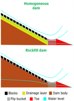 For both, the design includes a flip bucket to drive separately the overtopped flow and the infiltration flow. The flip bucket structure was successfully used in Barriga Dam [17], and consists of a concrete perimeter frame filled with porous material, depending on the type of dam. Moreover the flip bucket structure helps to support the blocks. Also for both solutions, a toe protection is disposed to drain the infiltration flow (Figure 11).