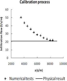 For validation, two numerical tests were carried out with discharge flow of 160 and 200 l/s/m and the value of coefficient previously obtained. The resulting infiltration flow rates were compared to those obtained in corresponding physical tests. The discrepancies between physical and numerical infiltration flow were 1.77 l/s/m and 0.87 l/s/m, which represent 13.3 % and 5.0 % of the infiltration flow, both within the measurement uncertainty range of the recording devices.