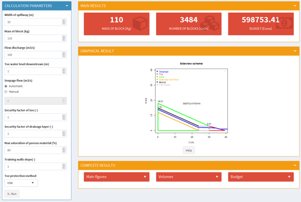 It should be noted that there is an option in the tool to carry out an economical optimization of a WSB spillway, regarding the provider’s range of blocks and several widths of discharge channel.