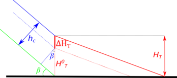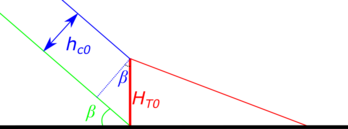 | Figure 14. Scheme of relation between parameters : height of toe for the previous iteration; : increase of height fixed by designer; : training walls height and : dam slope angle |