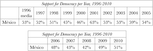 Unfortunately, the answer is probably not. The Latinobarometer Brief of 2010 showed that only 27% of the Mexican population had declared satisfaction with the democratic system of government; most of the interviewed determined that it had a lot to do with the amount of corruption that had rotted the system from its core and that government decisions were meant to benefit only a selected few 13 . Actually, those studies have showed that this point of view has not improved with the years but, on the contrary, has declined (as shown in Figure 3 ).