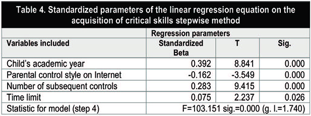 In the hierarchical regression analysis using the stepwise method, only those variables which make a significant contribution with the dependent variable are included in the model 3. Therefore, the analysis will permit us to identify which variables make a significant contribution to the acquisition of critical skills on the Internet. In the first block, only the children’s academic year enters into the regression model. This variable explains 27.2% of the variance. In the second block, neither the confidence in the interactive medium nor the parent’s concern regarding Internet risks influences the acquisition of the children’s critical skills. Consequently, none of the attitudinal variables play a significant role in the regression despite their relationship with the parenting style. In the final block, the parental style of control of Internet, the control of subsequent activities and the time limit make a significant contribution. Taken as a whole, the model explains 35.6% of the critical skills in the interactive medium.