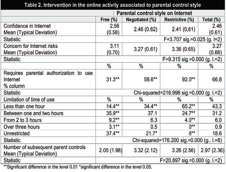 The relationship between the confidence and concern regarding Internet risks and the style of parental control on the Internet is coherent with the original hypothesis. Parents who adopted a free style tend to show a greater degree of confidence in the interactive medium (mean=2.56) compared to those who show a more restrictive style (mean=2.41). The awareness of the risks that children can run online also has a significant relationship with the style of parental control. Those who adopt a freestyle relation tend to show a lower degree of concern regarding the risks their children may run (mean=3.11), compared to those who are more restrictive in their relationship with the medium who show greater concern in this sense (mean=3.36).