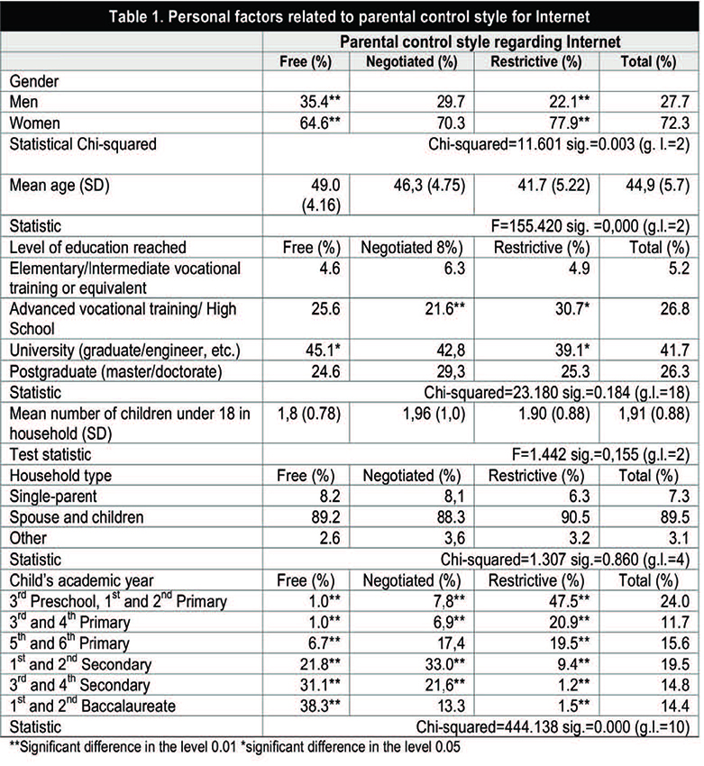 The gender of the respondent is associated with the parenting style for Internet access. The differences are produced in the free or little-restricted style which appears more frequently in men than women, and in the restrictive style where there is a higher proportion of women (77.9%) than men (22.1%). Taking into account the personal projection in the responses, it could be argued that mothers tend to place more restrictions on their children’s habits. The age factor also shows statistically significant differences. The fathers and mothers who practice a free and negotiated control of Internet are older (49 and 46.3 years old on average, respectively) than the parents of a more restrictive style (mean age= 41.7). The level of education completed shows some significant differences, although there is no clear tendency. In the freestyle relationship, there is a higher proportion of parents with university studies, while in the restrictive-style relationship there is a lower proportion of parents with university studies and a higher proportion of parents with vocational training and baccalaureate. The number of children under 18 and the type of household does not return statistically significant differences. Finally, the children’s level of education is a point that is related with the parenting style. Of interest is the fact that, at the first stages of academic learning (primary), there is a greater proportion of parents who adopt the restrictive style, compared to the period of secondary education and baccalaureate, when there is a higher proportion of negotiated and free access. In addition, the number of children in the household and the type of family (single-parent, spouses and children) is not associated with the style of family relationship.