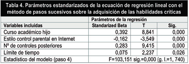 Atendiendo a los parámetros de la ecuación de regresión (Tabla 4) se aprecia que la variable con mayor capacidad predictiva es el curso académico. Como cabría esperar, a medida que los hijos están en niveles educativos superiores adquieren mayores habilidades en el uso de los medios interactivos. El control posterior de las actividades de los hijos en Internet es la segunda variable que más influye en la adquisición de las habilidades críticas. El sentido de la relación es positiva, es decir, a medida que hay más control por parte de los padres, mayor es la destreza adquirida por los menores. El estilo parental en Internet muestra un efecto significativo sobre la variable dependiente, pero en sentido inverso. A medida que los padres adoptan un estilo más restrictivo en el acceso a las aplicaciones de Internet, menor es el grado de adquisición de habilidades críticas de los menores. Por último, el periodo de tiempo permitido para utilizar Internet muestra una relación positiva con la adquisición de habilidades críticas. A mayor tiempo de uso, mayor es la adquisición de habilidades críticas, si bien esta variable es la que tiene menos peso en la ecuación de regresión.
