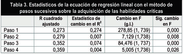 2 En la ecuación de regresión lineal se ha comprobado la independencia de los residuos mediante la prueba Durbin-Watson, la igualdad de las varianzas con el test de Levene y la ausencia de colinealidad de las variables. El criterio de entrada de las variables en la regresión es 0,05.