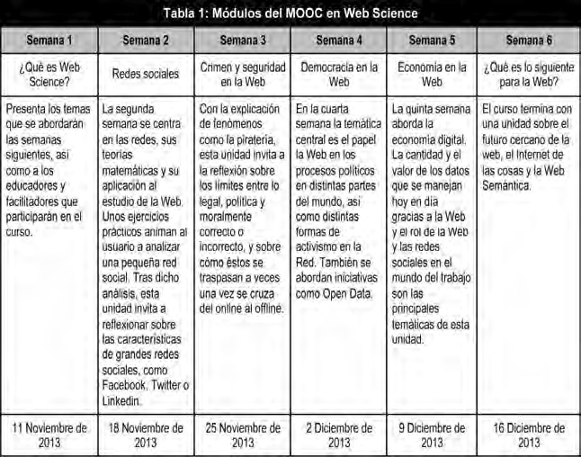 «Web Science» es un área de conocimiento que está adquiriendo especial relevancia en Reino Unido. En la Universidad de Southampton se desarrolla una carrera y un Máster en esta especialidad, y en noviembre de 2013 se inauguró el «Instituto en Web Science» con la finalidad de potenciar la investigación multidisciplinar en esta área. Podríamos traducir «Web Science» como «Ciencia de la Web». Estos estudios se centran en el impacto que la Web e Internet han estado teniendo en el mundo y se basan en el análisis de la web, desde una perspectiva multidisciplinar. De este modo, un alumno de Máster de Web Science estudia programación informática, sociología, economía y leyes, entre otras áreas, para intentar entender el fenómeno de la web y cómo está transformando el mundo. Como se define en la página web de la Universidad de Southampton (www.southampton.ac.uk/webscience), desde 1992 la World Wide Web (WWW) ha transformando los entornos laborales, sociales, económicos y políticos. Web Science se presenta como una nueva disciplina con el objetivo de promover el entendimiento de lo que implica la web como un fenómeno tanto tecnológico como social. El propio BernersLee, conocido por ser el creador de la WWW, estableció las bases de esta disciplina en 2006 al indicar que es necesario identificar las necesidades y los cambios que la web produce en el mundo, y que este ámbito abarca distintas disciplinas, debido al hecho de que la web debe ser estudiada como fenómeno social, comunicativo e incluso filosófico (BernersLee & al., 2006). En este contexto, el Departamento de Electrónica e Informática (ECS) y el Centro para la Innovación en Tecnologías y Educación (CITE) de la Universidad de Southampton, junto con el mencionado Web Science Institute lanzaron un MOOC sobre Web Science el 18 de septiembre de 2013 (Davis & al., 2014).