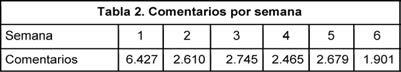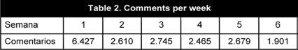 Otro dato a destacar fue la consistencia en el número de aportaciones. Si bien la primera semana destacó con casi 6.500 comentarios, las semanas siguientes registraron alrededor de 2.500, excepto la última con 1.900 (ver tabla 2), probablemente por el hecho de contener 14 pasos, en lugar de los 21 de media de las semanas anteriores.