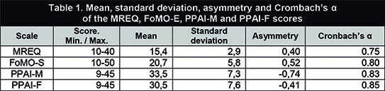 The MREQ, FoMO-S, PPAI-M and PPAI-F statistics are shown in Table 1. The distribution of MREQ and FoMO-S scores has positive asymmetry indexes. Based on the clusters identified by Carbonell & al. (2012) starting from the MREQ scores, our research found that 52% of students “have no problems” with the use of mobile phones, 46% have “occasional problems”, and 2% have “frequent problems”. The distribution of participants’ scores has a negative asymmetry in both the PPAI-M and the PPAI-F. In both cases, the students have high scores in the quality of communication with their parents. A positive correlation was observed between the MREQ and FoMO-E scores (r=0.53, p<.005); students who have a more problematic use of the mobile phone tend to have a higher degree of FoMO. Likewise, a positive correlation was observed (r= 0.55, p<.005) between the PPAI-M and PPAI-F scores; students with a higher quality of communication with their mothers tend to have a higher quality of communication with their fathers.