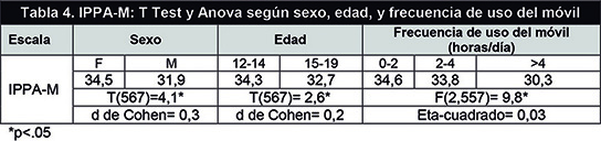 El análisis de varianza mostró diferencias significativas entre las puntuaciones medias del IPPA-P en función de la frecuencia de uso del móvil: el grupo de alumnos/as que usa de 0 a 2 horas el móvil tiene una puntuación media significativamente mayor que las de los grupos que lo usan más horas; esto es, a menor uso del móvil hay mayor comunicación con el padre. Sin embargo, el tamaño del efecto es bajo. No se observaron diferencias significativas entre las puntuaciones medias del IPPA-P en función del sexo y de las personas con las que el alumnado se comunica más por el móvil.
