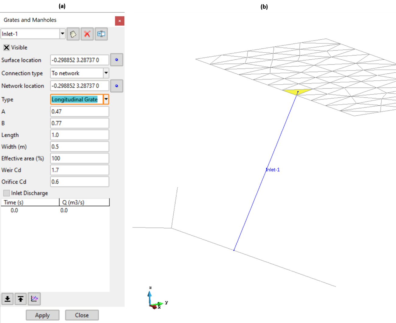 En el módulo de drenaje urbano conviven dominios unidimensionales y bidimensionales y, por lo tanto, también habrá mallas en 1D y mallas en 2D (Fig. 10). La malla puede ser estructurada (Fig. 10b) o no estructurada (Fig. 10c). En las mallas estructuradas, cada elemento de la misma está inequívocamente identificado por unos índices en coordenadas cartesianas. Por su parte, en mallas no estructuradas los elementos no tienen un orden particular. Los elementos de una malla estructurada en 2D por lo general son cuadriláteros, aunque también pueden ser triángulos equiláteros. En cambio, en una malla no estructurada pueden ser triángulos, cuadriláteros o una combinación de éstos. Las mallas no estructuradas tienen la ventaja de adaptarse mejor a geometrías complejas como las que presentan la batimetría y fronteras de estudios hidráulicos. Sin embargo, éstas requieren de una estructura de datos compleja y unos requerimientos de memoria mayores.