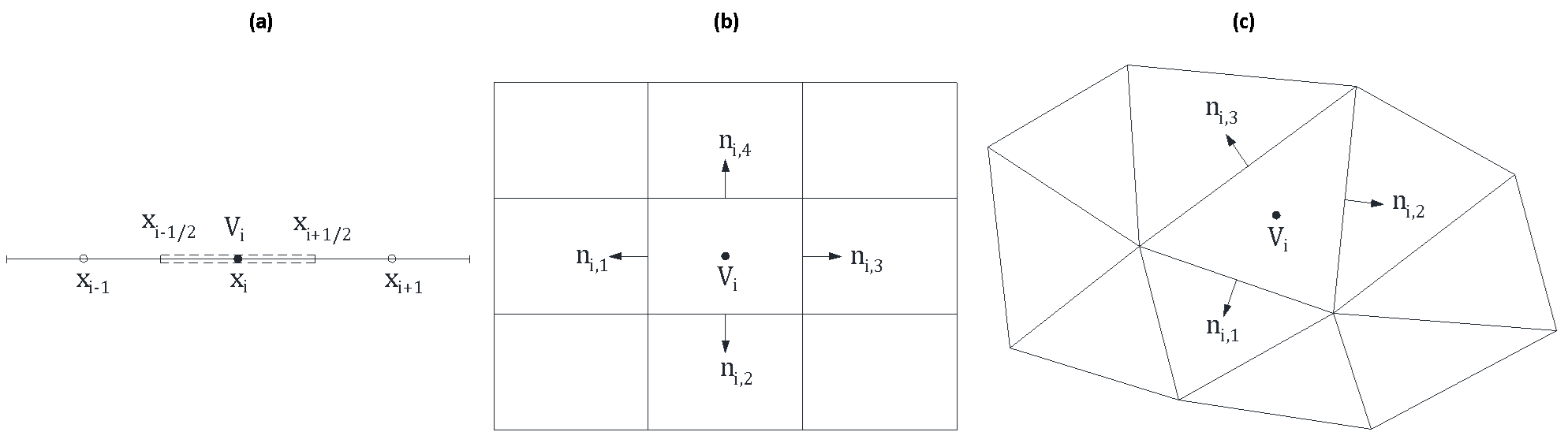 Fig. 10. Tipos de malla: (a) malla en una dimensión; (b) malla estructurada en dos dimensiones; (c) malla no estructurada en dos dimensiones.