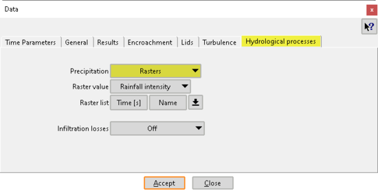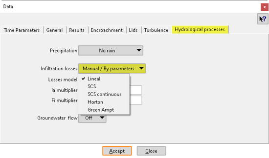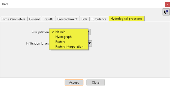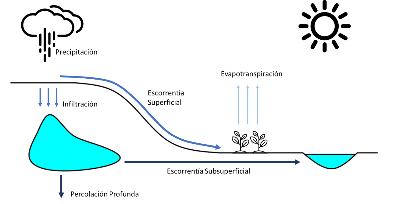 El módulo hidrológico es completamente bidimensional y distribuido en el espacio, y trabaja sobre la misma malla de cálculo que el módulo hidrodinámico. La base del módulo hidrológico es el módulo hidrodinámico, al que se le han añadido los procesos de aporte de agua por precipitación y la infiltración del agua en el terreno. De esta forma, el exceso de precipitación se mueve por el terreno y por los cauces de acuerdo con las ecuaciones de aguas someras bidimensionales. El agua infiltrada pasa a formar parte del subsuelo, en donde se puede realizar un balance de masa de agua distribuido en el espacio a nivel de elemento de la malla de cálculo. En dicho balance de agua en el terreno se consideran los procesos de infiltración, evapotranspiración, percolación y flujo en el subsuelo. Los tres primeros implican un movimiento de agua en la columna vertical, mientras que el flujo en el subsuelo se considera bidimensional y paralelo al terreno. Todos estos procesos pueden activarse o desactivarse por el usuario.