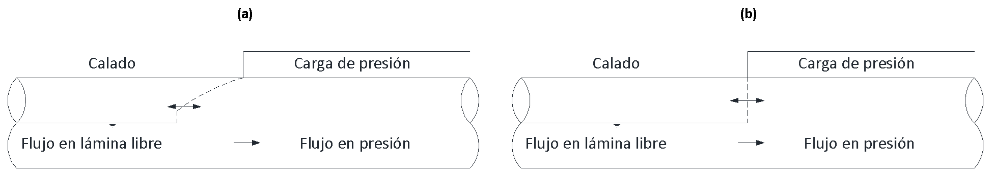Los frentes de onda generados en la transición de flujo en lámina libre a flujo en presión pueden ser de dos tipos: gradual, que consiste de un frente de onda en lámina libre con condiciones de flujo en lámina libre en ambos lados del frente (Fig. 11a); o brusco, que es un frente de onda a tubo lleno con condiciones de flujo en lámina libre delante y flujo en presión atrás del mismo (Fig. 11b). Además, estos frentes de onda de presión se pueden clasificar como: interfase positiva (el frente de onda de presión se mueve hacia el flujo en lámina libre), interfase negativa (el frente de onda de presión se mueve hacia el flujo en presión), o interfase con cambio de dirección (el frente de onda se mueve de una interfase positiva hacia una interfase negativa o viceversa).