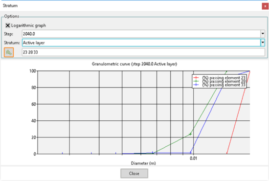 Finalmente, para el módulo de Transporte de Sedimentos para mezclas se ha diseñado una nueva funcionalidad que permite conocer la distribución granulométrica de la muestra. Para ello, es necesario ir a Herramientas Iber >> Transporte de Sedimentos >> Granulometría. La Fig. 9 muestra, a modo de ejemplo, la granulometría en un instante de tiempo concreto en los elementos 23, 28 y 33. Como se observa, la gráfica está en escala logarítmica.
