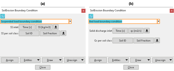 Una vez definidos los datos generales y definidas/asignadas las propiedades del sedimento, deben asignarse las condiciones de contorno. Dichas condiciones deben asignarse únicamente en los contornos de entrada de caudal. En caso de no asignarse, se considerará que no entra sedimento por dichos contornos.