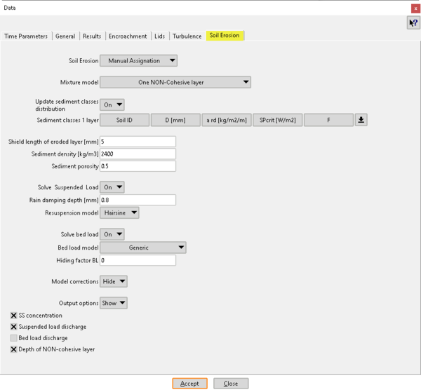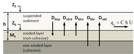 El módulo puede trabajar con distintos niveles de complejidad de la estructura del suelo, mediante la activación o no de los diferentes procesos de erosión considerados. De esta manera, se pueden considerar una única capa de suelo erosionado (no cohesivo), o dos capas de suelo, una correspondiente a la matriz original del suelo (cohesiva) y otra correspondiente al suelo erosionado (no cohesivo). Las partículas de ambas capas pueden ponerse en movimiento por el impacto de la lluvia y por la fricción que genera el agua con el fondo. Una vez en movimiento, los procesos de transporte de sólidos considerados son por carga de fondo y en suspensión, si bien en la mayor parte de los casos el transporte en suspensión de partículas finas será predominante en las laderas de las cuencas. Asimismo, se consideran diferentes clases o tipos de sedimento, por lo que permite trabajar con granulometrías distribuidas si el usuario lo considera necesario.