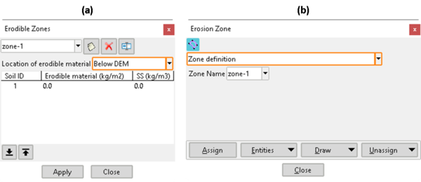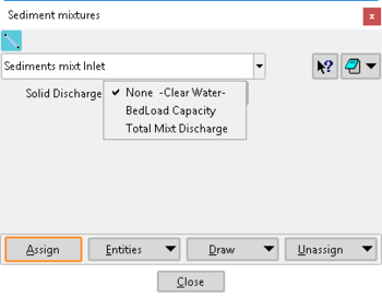Una vez definidas las “mezclas”, es posible asignarlas mediante el menú Datos >> Transporte de sedimentos >> Transporte de fondo (mezclas) >> Asignación de mezclas. Esto se puede hacer tanto en la geometría como en la malla de cálculo (Fig. 40b). Todas aquellas “mezclas” que se hayan creado en la ventana anterior, se mostrarán en una lista para poder asignarlas al modelo.