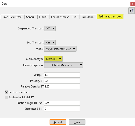 Fig. 38. Datos generales del módulo de transporte de sedimentos (mezclas).
