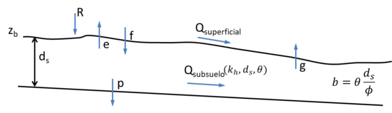 En ellas, es el calado de agua, y son las dos componentes del caudal unitario, es su módulo, es la intensidad de precipitación, es la tasa de infiltración, es la cota del fondo, es la aceleración de la gravedad y es el coeficiente de Manning.