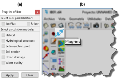 Fig. 4. (a) Ventana de selección de plug-ins. (b) Activación de los plug-ins mediante el atajo en la barra de herramientas de Iber.
