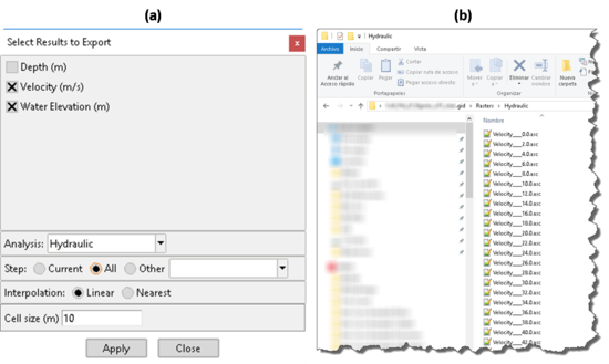 En cuanto al post-proceso, la principal novedad está en una mejora sustancial del tiempo de respuesta y de cálculo para con la generación de rasters de resultados (Herramientas Iber >> Resultados a Raster). Además, en la actual versión existe la posibilidad de cambiar el tipo de análisis, seleccionar en qué instante de tiempo se desea extraer el resultado o resultados, y se han mejorado las opciones de exportación para que sean más rápidas y eficientes. De este modo, un/a usuario/a puede seleccionar uno o varios resultados de un análisis concreto, exportarlos en el paso de tiempo que está activo, en todos o en uno concreto que no se esté visualizando, con un tipo u otro de interpolación y un tamaño de celda determinado. Los resultados se guardarán dentro de la carpeta del modelo preservando la clasificación por medio del tipo de análisis y paso de tiempo. Por ejemplo, si se seleccionan ‘Velocidad’ y ‘Cota de agua’ (Fig. 8a) y se aplica, en la carpeta del modelo se crearán los n rasters de velocidad y cota de agua asociados a los n pasos de tiempo analizados (Fig. 8b).