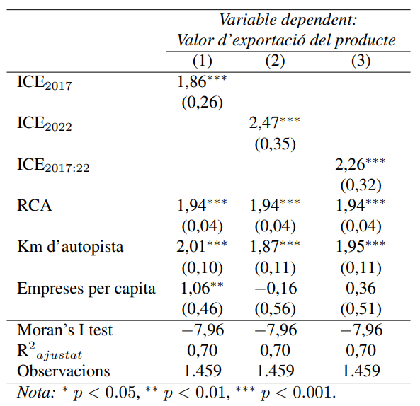 Finalment, s’aplica un model economètric (vegi's l'Equació (1)) per inferir l’impacte del nivell de l'ICE sobre el valor total de l'exportació de cada producte (i) produït dins de cada província catalana (z). S’observa un efecte positiu i estadísticament significatiu. De fet, la magnitud de l'efecte és superior al d'altres variables clau (e.g., l’RCA, el nivell de les infraestructures de transport i la mida del teixit empresarial provincial).