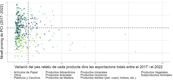 Fig. 1. Evolució de la complexitat de les exportacions catalanes (2017-2022). Nota: La mida dels punts augmenta segons el valor RCA de cada producte.