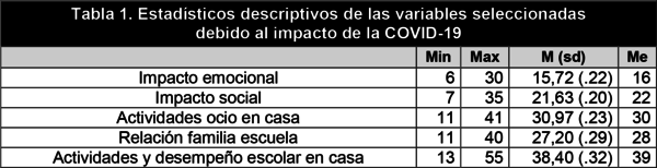 Las respuestas se recogieron en una escala tipo Likert de cinco categorías desde el valor más reducido (1: totalmente en desacuerdo) hasta el valor más alto (5: totalmente de acuerdo). Para calcular los sumatorios de las dimensiones se invirtieron los valores de respuestas para unificar la dirección de la evaluación. Las dimensiones impacto emocional y social se calcularon en sentido negativo (invirtiendo las escalas positivas, como las relacionadas con la alegría y la tranquilidad), por el contrario, las dimensiones: el tiempo empleado en actividades de ocio saludable y supervisado en casa, impacto sobre el desempeño escolar (realizada desde casa) y la relación familia-escuela se calcularon en una dirección positiva, es decir, a una mayor puntuación mayor satisfacción (a diferencias de las dimensiones de impacto social y emocional).