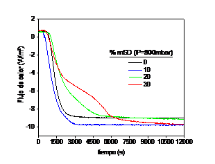 La representación de los perfiles de temperatura muestra cómo su pendiente en el estado transitorio (tiempo<4500 s) es prácticamente independiente del contenido en microcápsulas para las espumas sintetizadas a presión atmosférica y a 700 mbar, no evidenciándose el efecto amortiguador térmico de las microcápsulas. Sin embargo, lo perfiles de las espumas obtenidas empleando 800 mbar de presión muestran una menor pendiente a medida que aumenta el contenido en microcápsulas, indicando un fuerte efecto amortiguador y por tanto, un mayor tiempo de operación (tiempo >7500 s para mSD=30 %p/p). Además, una vez alcanzado el estado estacionario, se observa una menor temperatura final de la superficie externa con respecto a la temperatura de la espuma sin microcápsulas. Esta menor temperatura sugiere que la conductividad térmica de las espumas sintetizadas a 800 mbar disminuye con el contenido de microcápsulas. Puede observarse como a presión atmosférica y a presión de 700 mbar, el perfil térmico de las espumas conteniendo mSDs queda siempre por encima del de la espuma libre de microcápsulas y por tanto, no se consigue en estas condiciones un material que conserve su capacidad aislante. Estos resultados permiten concluir que una presión de 800 mbar permitiría sintetizar espumas RPU con capacidad aislante y con gran capacidad de almacenamiento térmico.