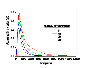 Una vez obtenidos los perfiles de temperatura y flujos de calor entrante y saliente podemos calcular tanto el perfil de acumulación de calor como los parámetros de capacidad de almacenamiento térmico, TES, y conductividad térmica para cada espuma. En la Figura 9 se muestra a modo de ejemplo el perfil de acumulación de calor para las espumas sintetizadas a 800 mbar. Como era de esperar a mayor contenido de microcápsulas mayor es el área bajo la curva de acumulación de las espumas y mayor es su tiempo de acumulación de energía.