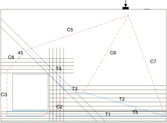 O esquema indicado pela figura 9 mostra os elementos do modelo biela‐tirante elaborados segundo as topologias ótimas de maneira direta. Observa‐se que na proposta esquematizada as semirretas em vermelho e azul indicam, respectivamente, os membros comprimidos, bielas, e os tracionados, tirantes.