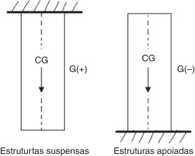 No caso dos elementos dispostos na vertical, o peso próprio (G) atua na direção do eixo longitudinal da peça e provoca esforço axial, que pode ter um efeito diferenciado dependendo da sua vinculação.