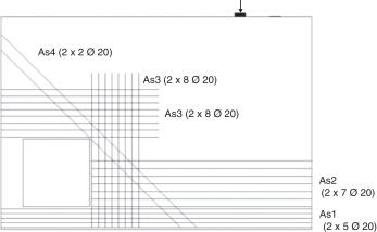 O tirante T4 tem sua representação na malha ortogonal, As3 , que cobre o trecho junto à borda da cavidade e os encontros de bielas C3 e C8 na extremidade esquerda, e na armadura complementar As4 , a 45 graus, cobrindo os encontros de bielas C2, C5 e C8.