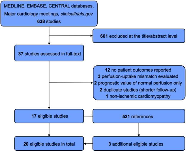 We searched MEDLINE, EMBASE, and CENTRAL using the terms positron emission tomography, myocard*, perfusion, and (prognos* OR predict*) for eligible studies without year restriction. We limited the search to English language studies in humans. Latest update search was performed on April 25, 2014. We also searched abstracts and presentations of the most recent major cardiology meetings and the clinicaltrials.gov registry for yet unpublished studies. Finally, we perused the reference lists of all eligible articles for any additional studies not identified with the above searches.